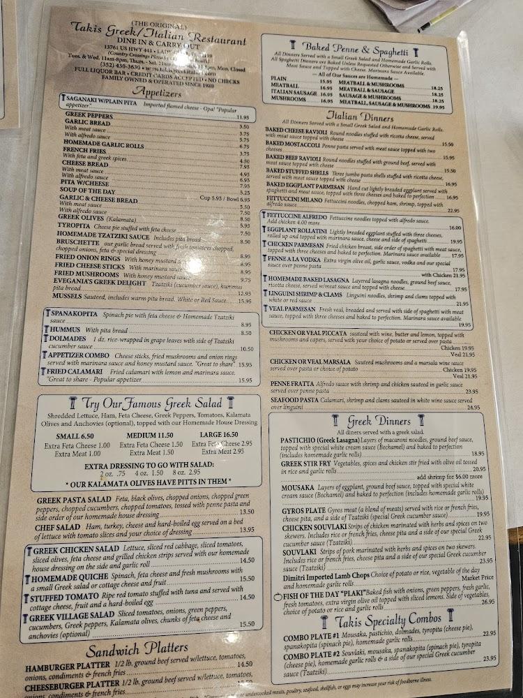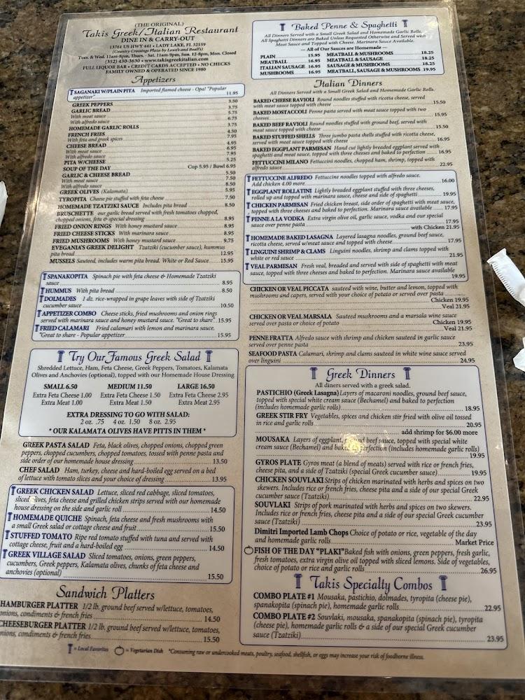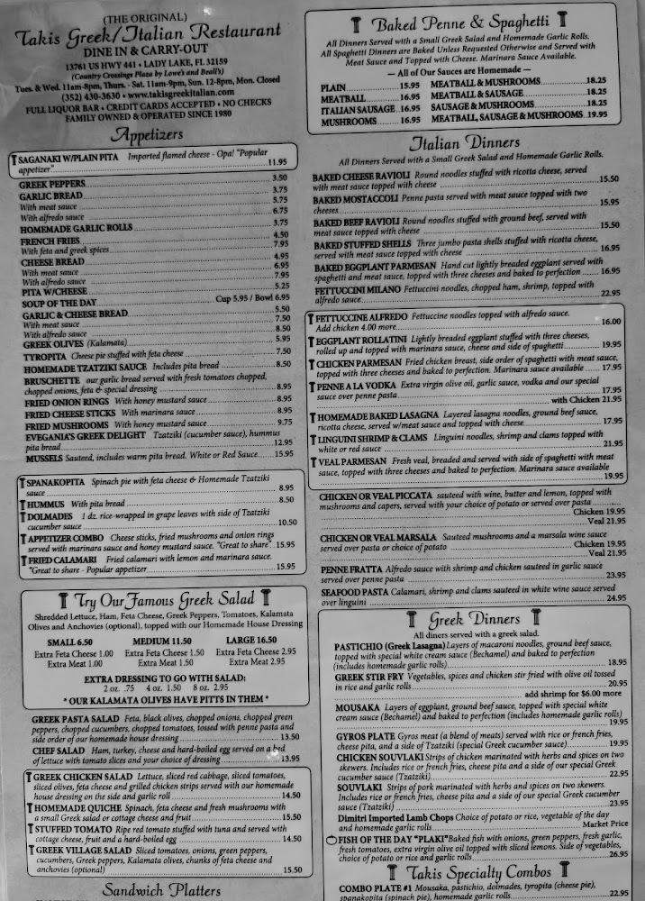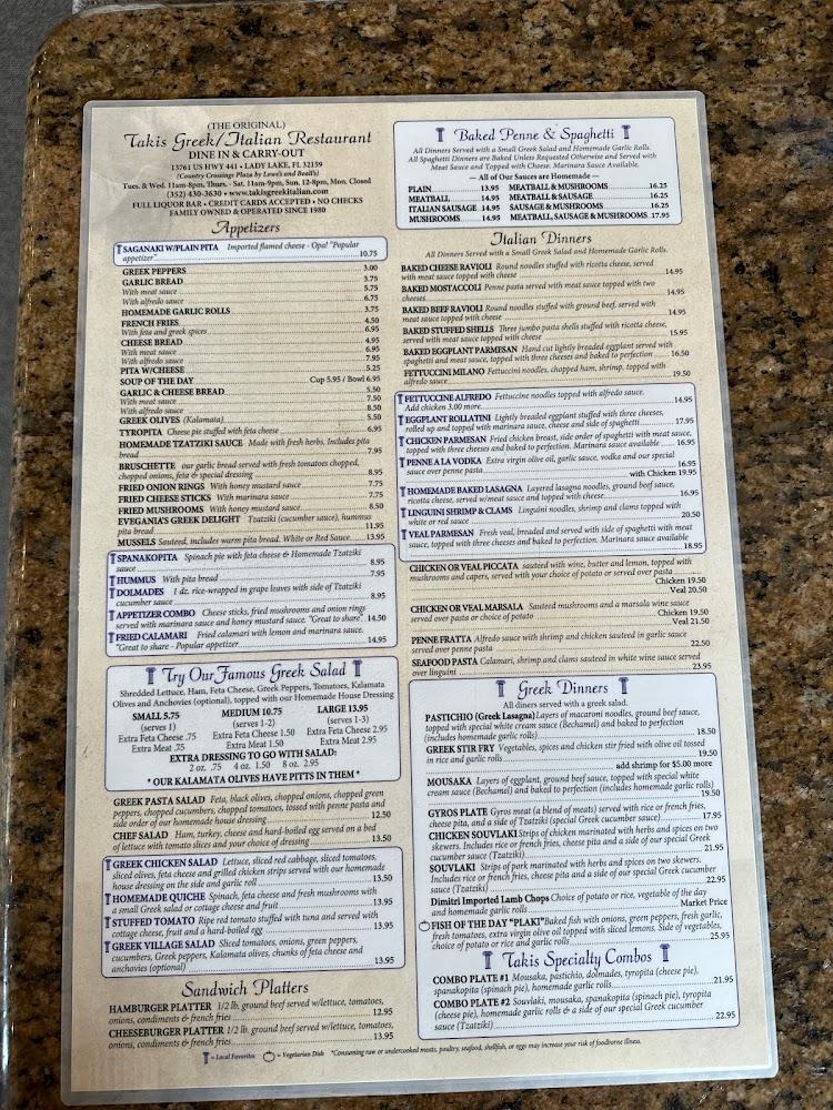 Welcome to Takis Greek-Italian Restaurant, where culinary traditions meet in a delightful blend! Located in Lady Lake, FL, our cozy establishment offers a vibrant menu featuring authentic Greek and Italian dishes, perfect for lunch or dinner. Enjoy our excellent café, refreshing cocktails, and an extensive selection of beers and wines in a relaxed atmosphere. Whether you’re dining solo, with a group, or picking up takeout, our friendly team ensures quick service and a great experience. Accessible for all, we invite you to savor wholesome, traditional cuisine, including vegetarian options, in our charming terrace setting. Come and taste the difference at Takis!